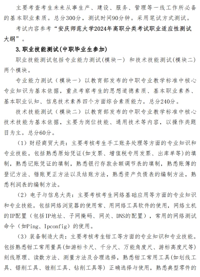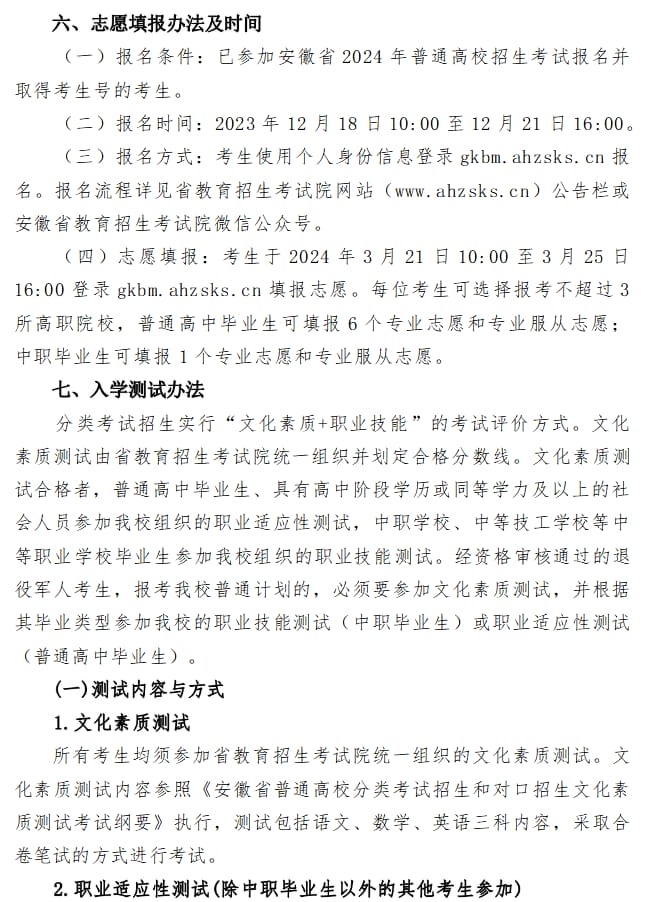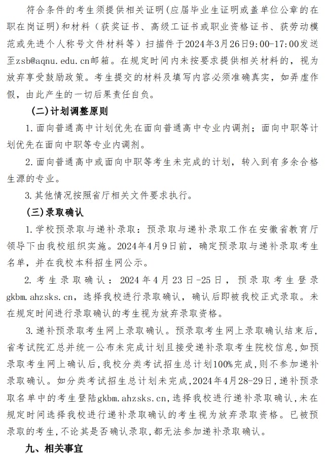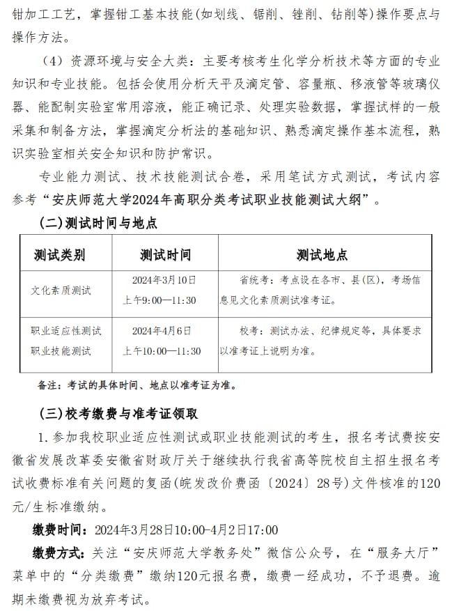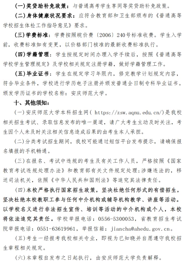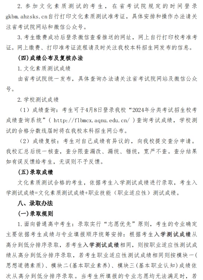 安庆师范大学2024年分类考试招生章程